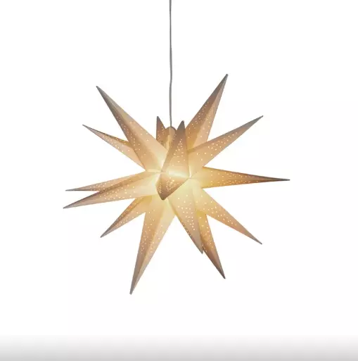 3D pappstjerne i hvitt med varmhvit LEDlys. Hvit kabel med bryter. Oppheng har plastkuppel med utskiftbar LED lyskilde.