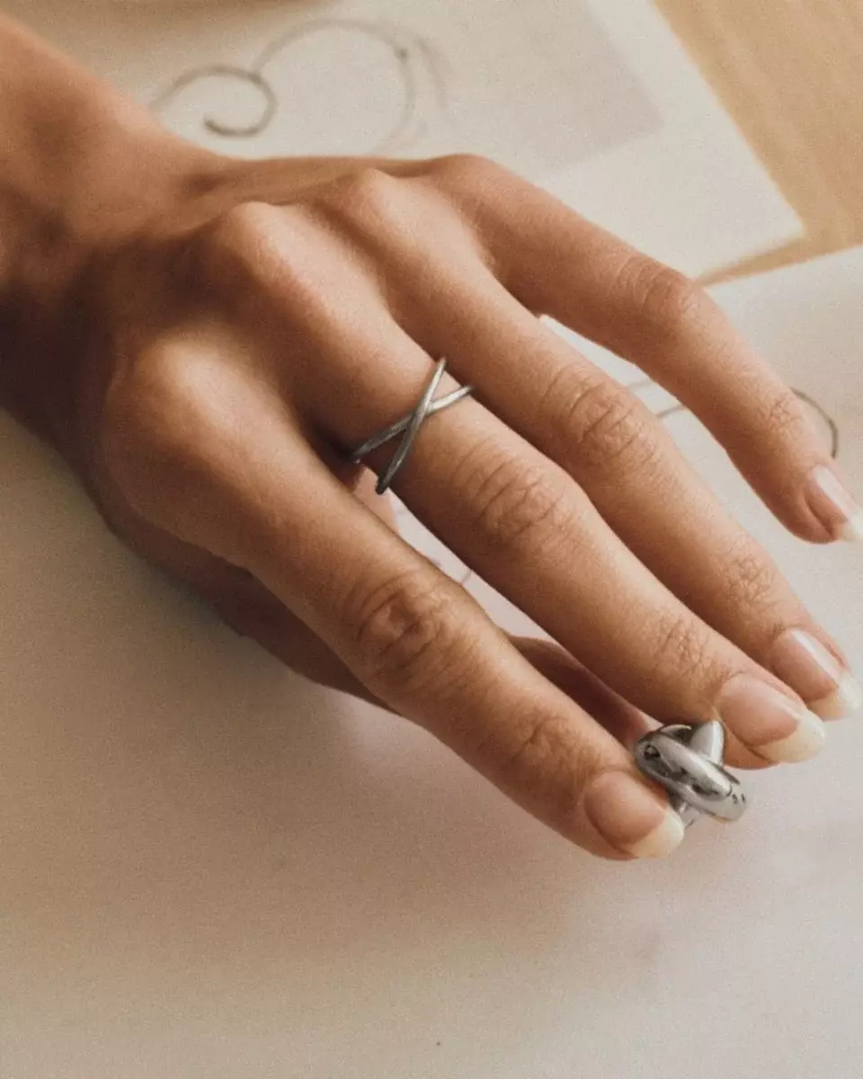 Alexa er en sterk serie med et rent og elegant skulpturelt design med deler som skiller seg ut – perfekt for layering og stabling til både hverdags- og festbruk. Her med en tynnere ring i blankt rustfritt stål med en vakker X-form som sitter pent på fingeren. Style den gjerne med armbånd, halskjede eller øredobber fra samme serie.