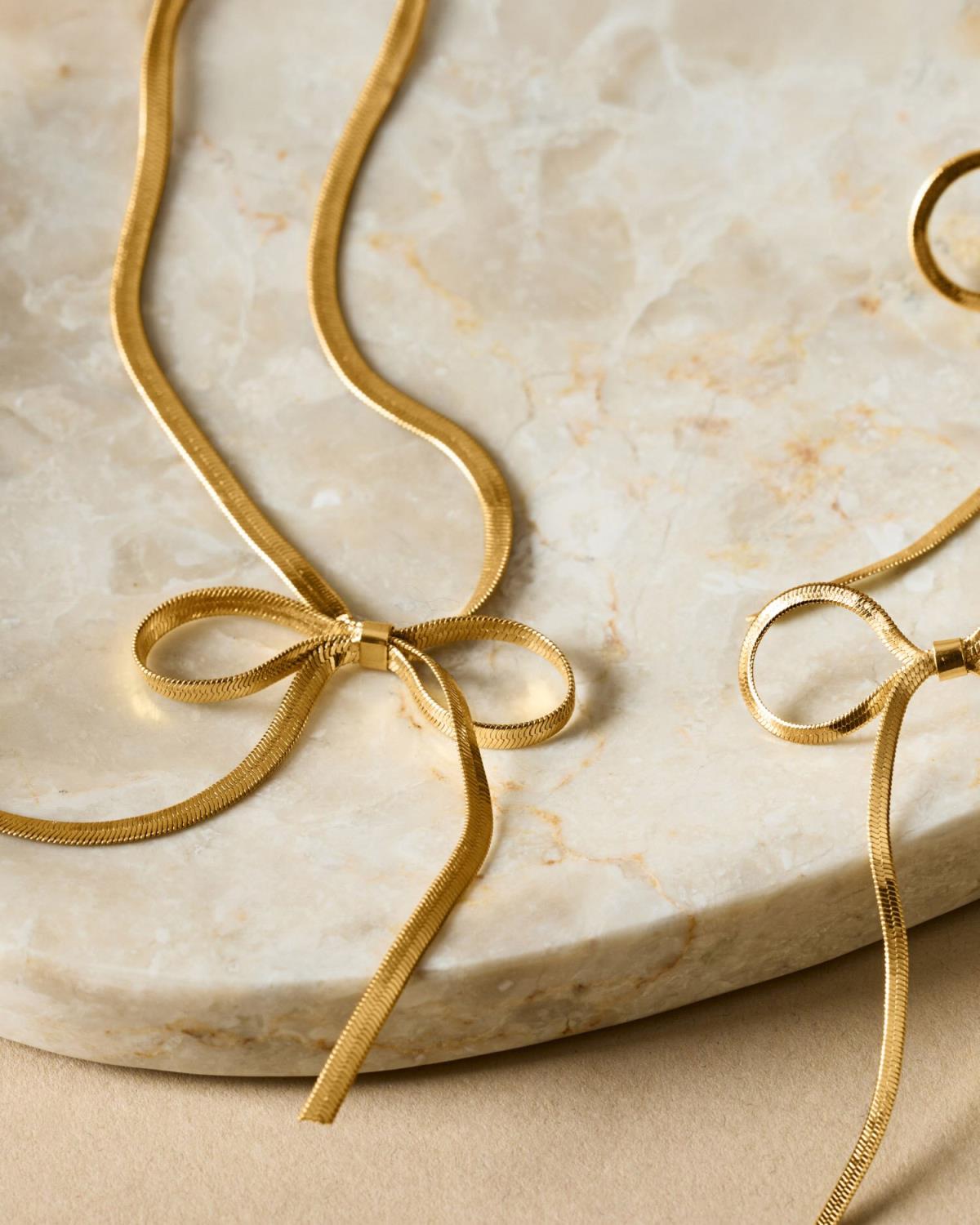 Amelie-sløyfehalskjede er laget av slitesterkt 18 karat gull PVD-belegg, noe som gjør det sertifisert vanntett, svettebestandig og livløs. Med et sløyfedesign som gir et snev av eleganse til ethvert antrekk, spesielt når det kombineres med matchende øredobber. Det leveres i en gjenbrukbar pose i semsket skinn, og er ideelt å gi bort i gave eller å ta med seg på farten.