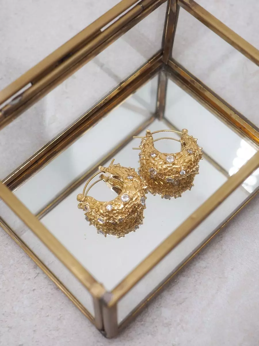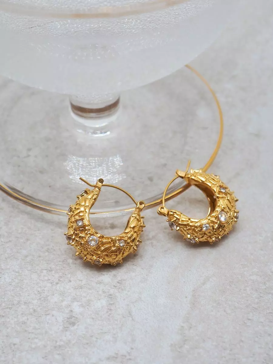 Disse gullfargede hesteskohoopsene i stainless steel kombinerer klassisk design med et subtilt glimt av små zirkoner.