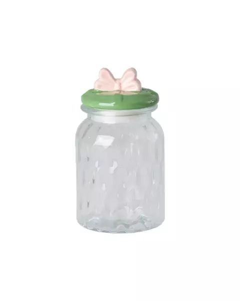 Glasskrukke med et grønt lokk toppet med en elegant sløyfe. Den er ikke bare pen, den er også utrolig praktisk. Forseglingen sørger for at godbitene dine holder seg trygge og sprø, og bevarer den tilfredsstillende sprøheten. Enten det er kjeks, godteri eller hjemmelaget granola, gir denne krukken et fargeinnslag og et snev av moro til kjøkkenet ditt.