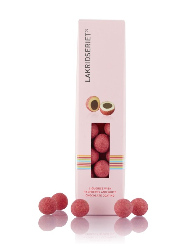 Lakris med Bringebærsmak i Hvit Sjokolade.