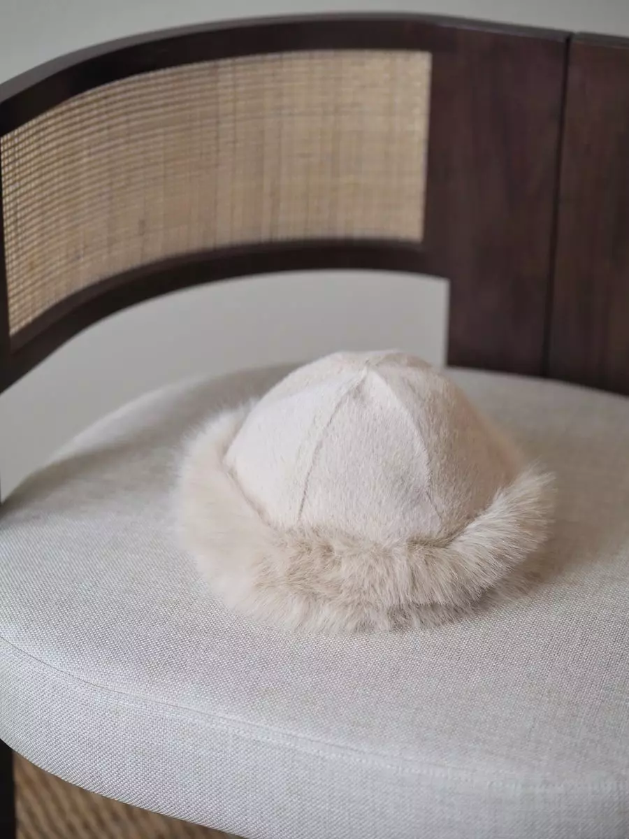 Denne beige luen i fuskepels kombinerer varme og stil på en elegant måte.