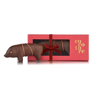 Marsipangris trukket i sjokolade i en rød gaveeske.